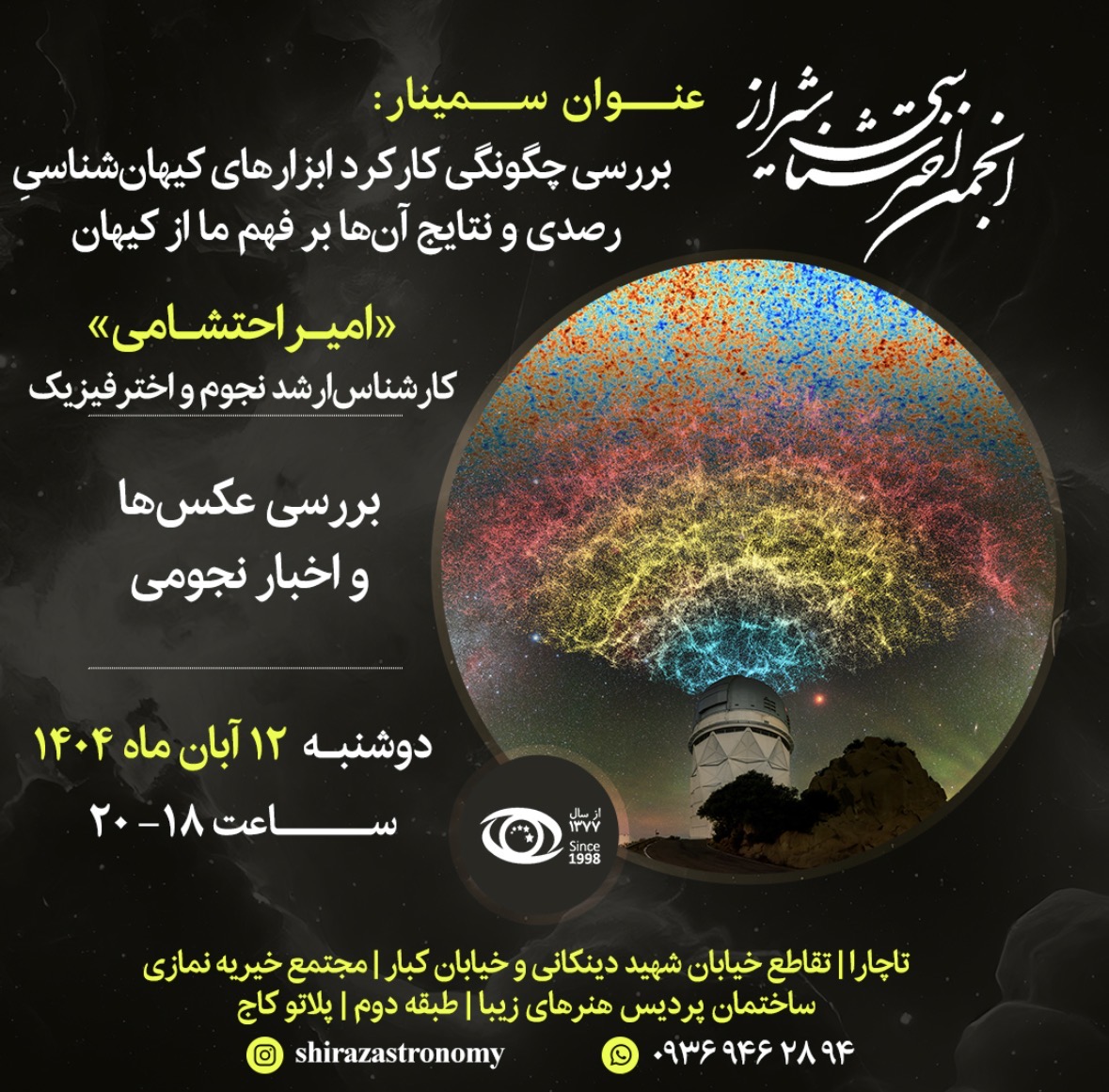 سلام به اطلاع همراهان گرامی میرسانیم بیست و هشتمین نشست هفتگی انجمن اخترشناسی شیراز در سال ۱۴۰۴، دوشنبه ۱۲ آبان ماه در این آدرس برگزار میگردد: