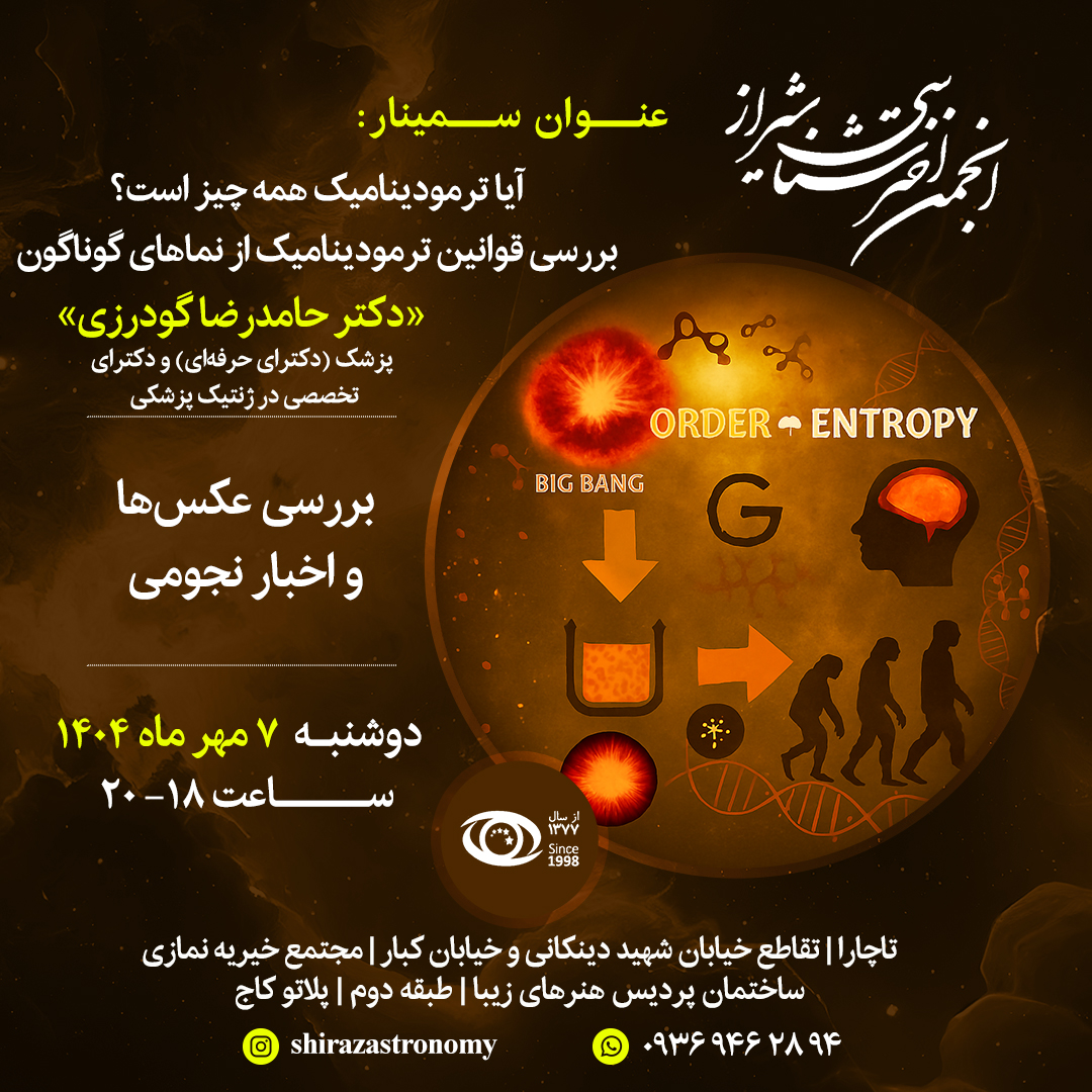 سلام به اطلاع همراهان گرامی میرسانیم بیست و سومین نشست هفتگی انجمن اخترشناسی شیراز در سال ۱۴۰۴، دوشنبه ۷ مهر ماه در این آدرس برگزار میگردد: