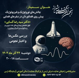 به اطلاع همراهان گرامی میرسانیم سیامین جلسه هفتگی انجمن اخترشناسی شیراز در سال 1403، شنبه 19 آبانماه در این آدرس برگزار میشود: